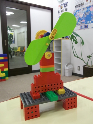 また、ギアをふたつ使うことで、ハンドルと羽が逆回転する扇風機を作りました。